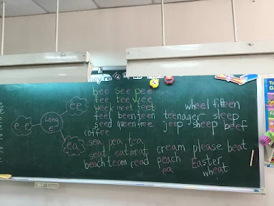 然後,我在這些母音組合音旁用加上子音,例如b-ee, s-ee, t-ea,當我寫時,學生會自行拼讀念出。