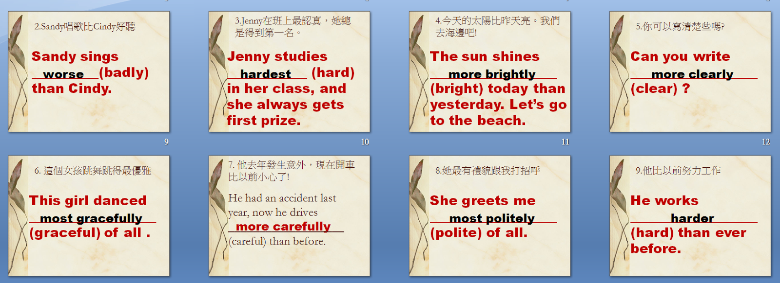 b.副詞比較級形成與造句。